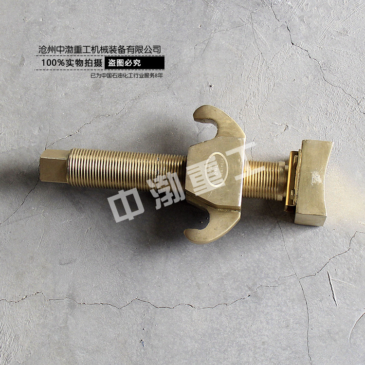防爆鏈子鉗由鋸齒形螺桿,鋸齒形鉤舌、鏈條、管鉗手柄等組成,鋸齒形螺桿由螺桿銷為軸心,固定在管鉗手柄設(shè)有凹槽的預(yù)留孔中;鋸齒形鉤舌設(shè)有鋸齒和鉤舌兩部分。