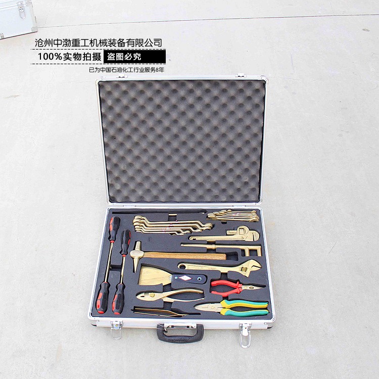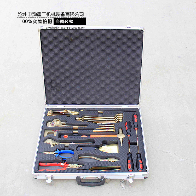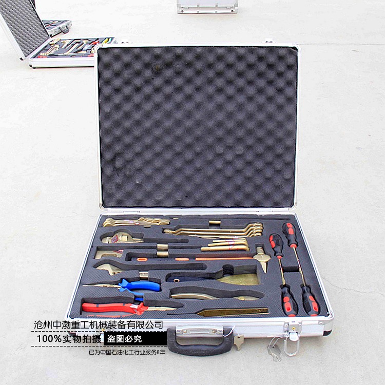 公司生產(chǎn)的防爆工具箱種類齊全,包括:加油站用組合工具箱、油庫用組合工具箱、天然氣用組合工具箱、礦山搶險用組合工具箱、檢維修用組合工具箱、成品油計量工具箱等。  工具箱規(guī)格:7件套、10件套、12件套、16件套、24件套、30件套、32件套、36件套、42件套、50件套、56件套、100件套等。公司還可以根據(jù)客戶的實際工作需要組合常用的防爆工具套裝。   公司生產(chǎn)的防爆工具有400余個系列近萬種規(guī)格。該產(chǎn)品能有效的防止工具與工作物相互摩擦、撞擊時產(chǎn)生的可燃性爆炸,確保財產(chǎn)和人身安全。廣泛用于石油、化工、礦山、防恐怖、防磁場、煤礦、采氣、油氣管道、發(fā)電、冶金、航空、儲運、制藥、制氣、塑料、化纖、皮革、煙火、爆竹等行業(yè)。