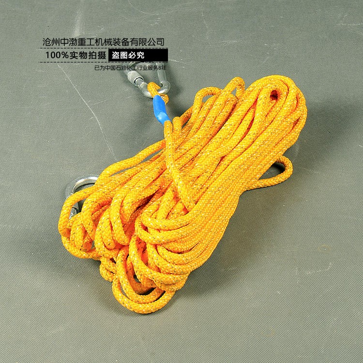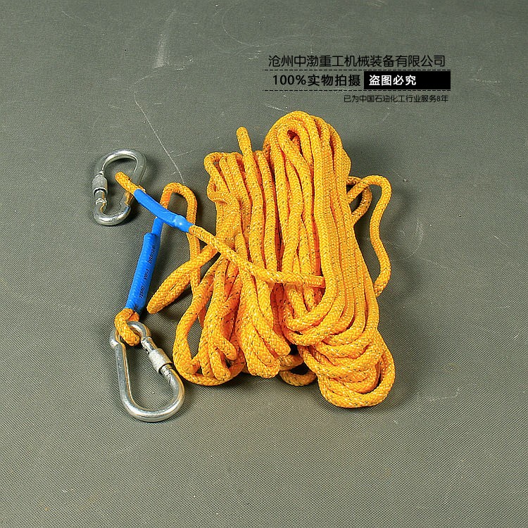 目前使用的救生繩主要是精制麻繩,繩的直徑為6毫米~14毫米,長(zhǎng)度為15米~30米,消防員用耐火救生繩通常用2.6mm航空鋼絲包芯。通常將直徑小的救生繩稱為拋繩、引繩或標(biāo)繩,將直徑大的救生繩稱為安全繩。