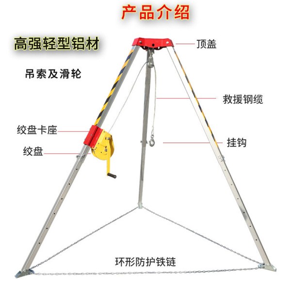 救援三腳架是一種專門設(shè)計用于緊急救援和高空作業(yè)場景的重要設(shè)備,通常由高強度鋁合金或不銹鋼材質(zhì)制成,具有出色的耐用性和承載能力,配備了安全帶、掛鉤等附件,以保障被救援人員或作業(yè)人員的安全。它操作簡便,易于攜帶和部署,廣泛應(yīng)用于消防救援、礦山救援、建筑施工等領(lǐng)域,是保障生命安全的重要工具